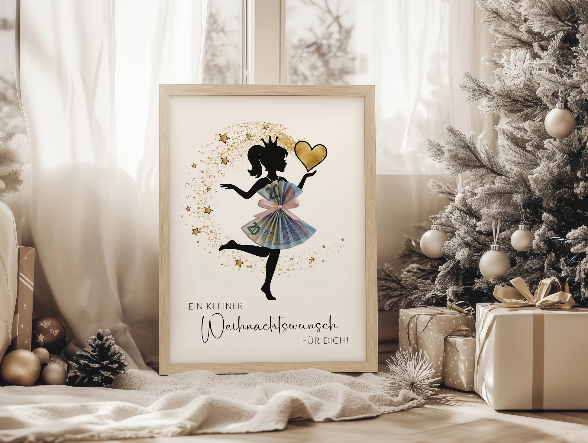 💡 Tipp: Drucke dein Lieblingsformat aus und forme aus Geldscheinen das Kleid der Figur – so entsteht ein einzigartiges und bezauberndes DIY-Geldgeschenk zu Weihnachten!
