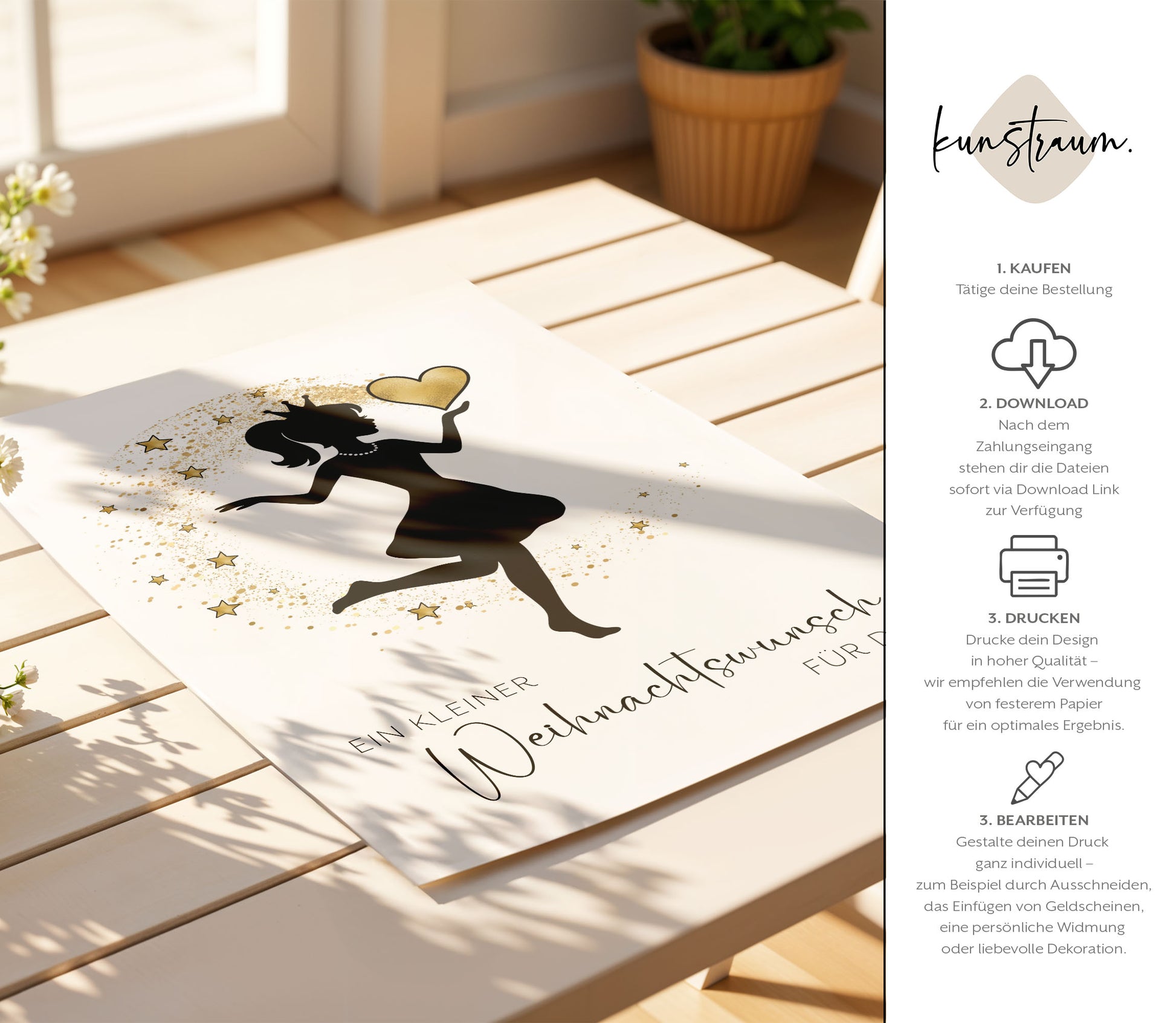 Einfach, schnell und stressfrei: Nach dem Kauf erhältst du sofort Zugriff per E-Mail auf deine digitale Vorlage. Lade die Datei herunter, drucke sie in deinem gewünschten Format aus und gestalte sie ganz nach deinem Geschmack – mit einem Geldschein, einem persönlichen Gruß oder einer kreativen Dekoidee. In wenigen Minuten wird daraus ein individuelles Geschenk mit Stil und Bedeutung – ganz ohne Versandzeit und Wartefrust.