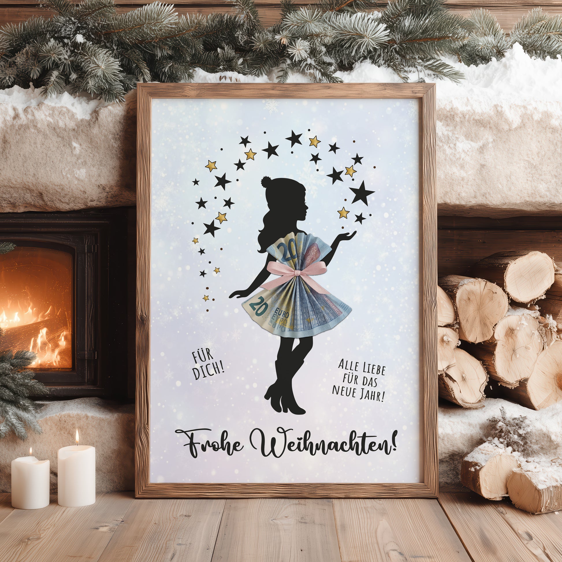 💡 Tipp: Drucke dein Lieblingsformat aus und forme aus Geldscheinen das Kleid der Figur – so entsteht ein einzigartiges und bezauberndes DIY-Geldgeschenk zu Weihnachten!