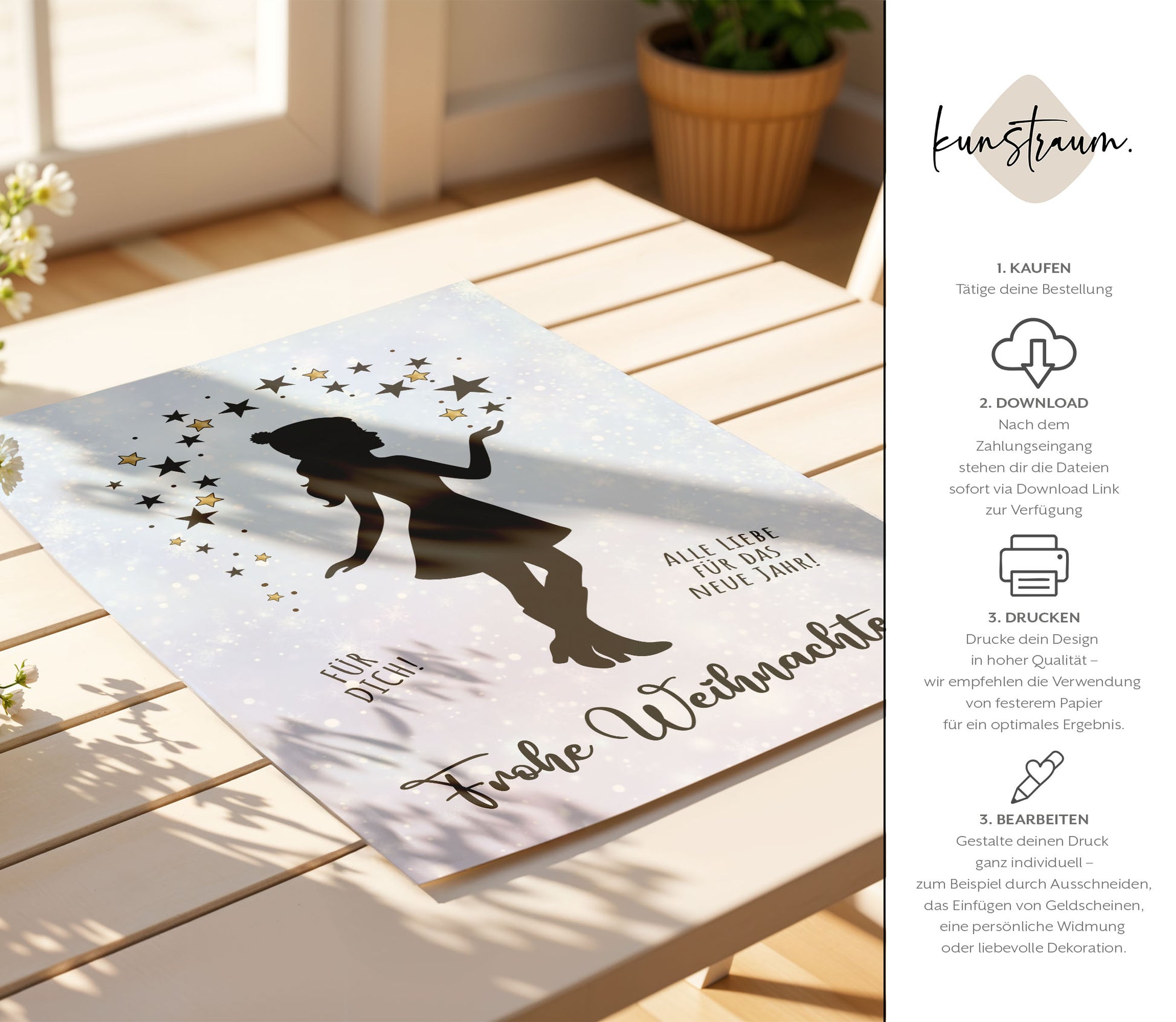 Einfach, schnell und stressfrei: Nach dem Kauf erhältst du sofort Zugriff per E-Mail auf deine digitale Vorlage. Lade die Datei herunter, drucke sie in deinem gewünschten Format aus und gestalte sie ganz nach deinem Geschmack – mit einem Geldschein, einem persönlichen Gruß oder einer kreativen Dekoidee. In wenigen Minuten wird daraus ein individuelles Geschenk mit Stil und Bedeutung – ganz ohne Versandzeit und Wartefrust.