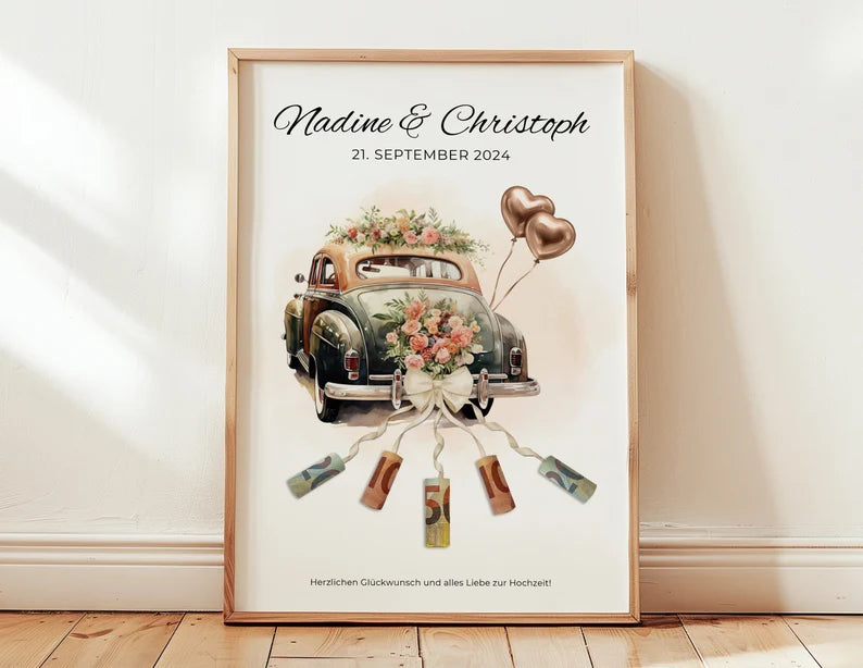Stilvolles Design: Ein elegantes Hochzeitsauto mit Blumen und Ballons, kombiniert mit einem klaren Layout für Geldscheine – modern und liebevoll zugleich.