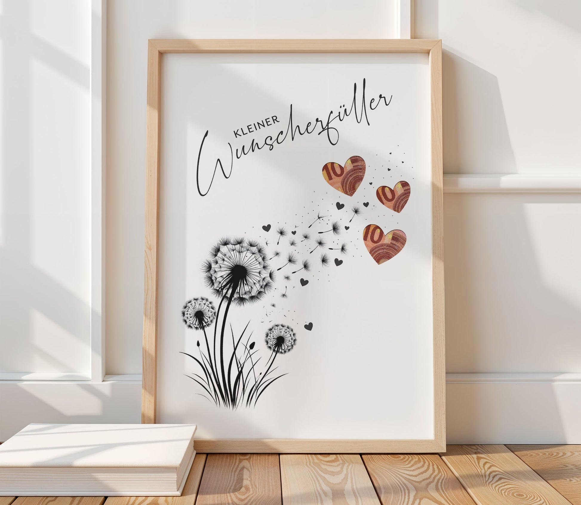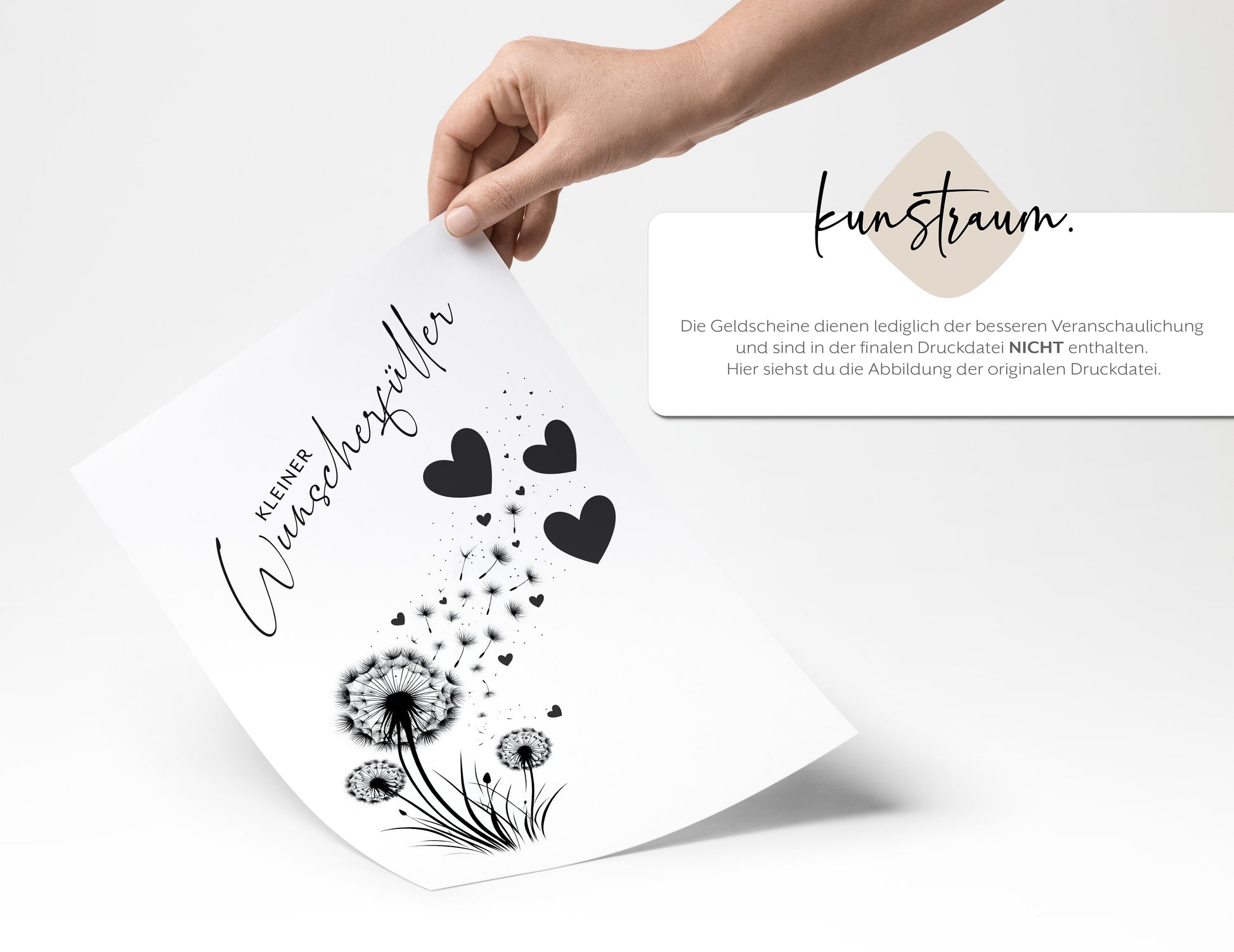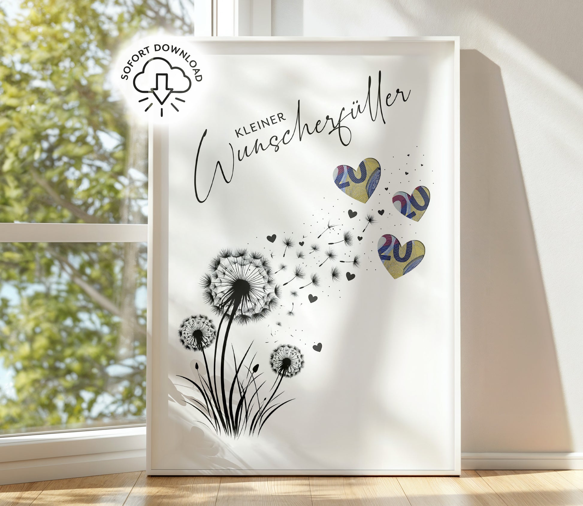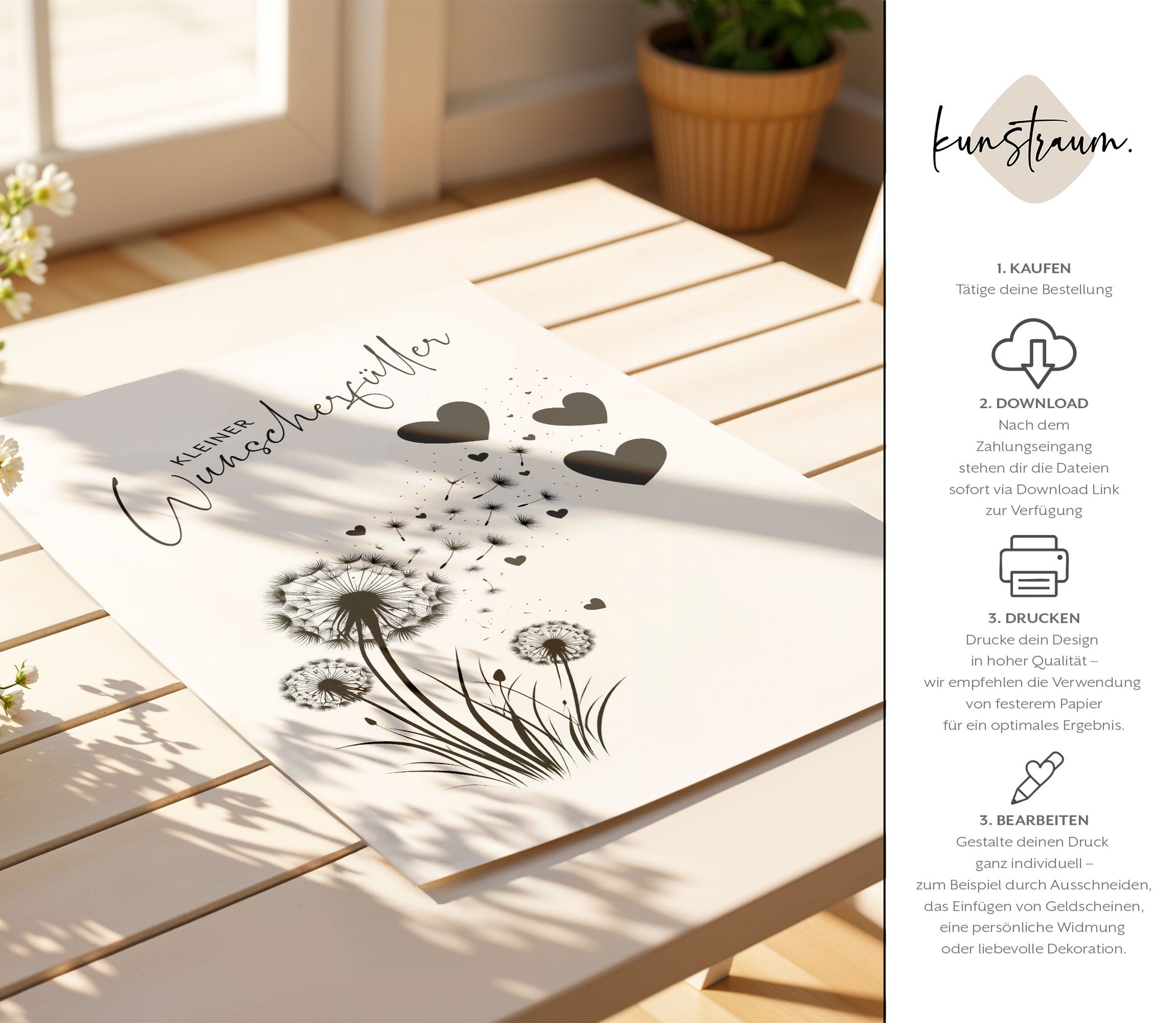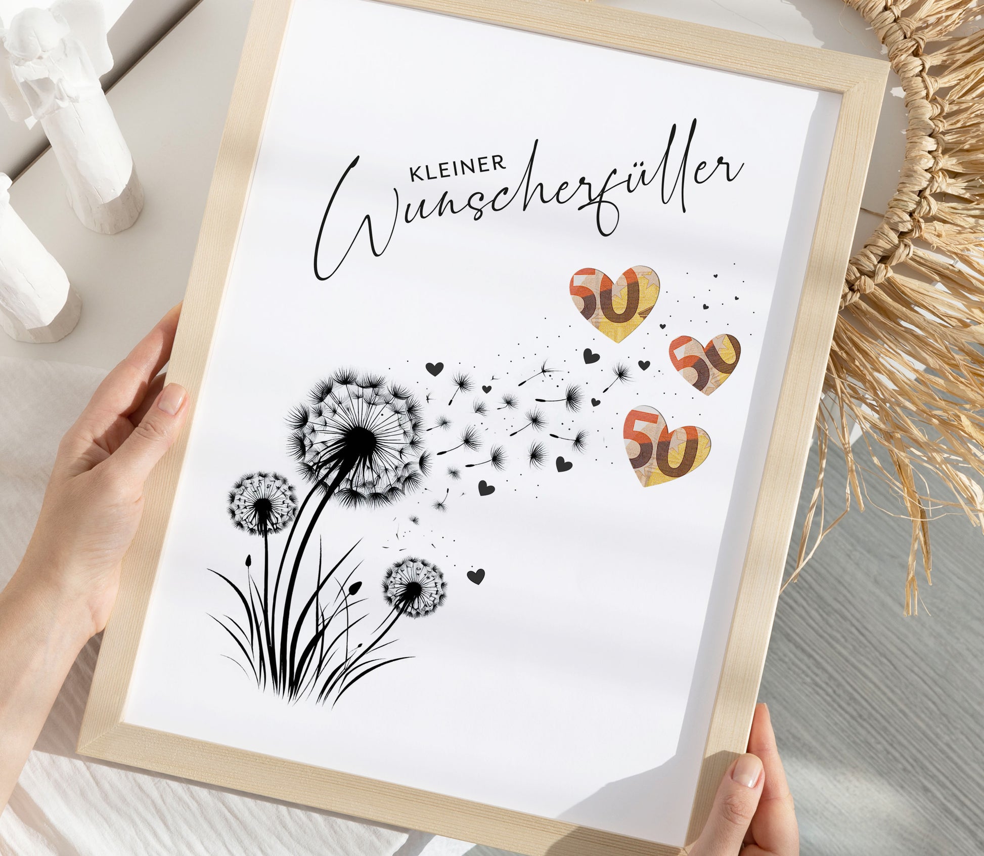 Die zarten Pusteblumen stehen für Wünsche, Hoffnung und neue Wege – kombiniert mit den Herzformen für Geldscheine entsteht ein liebevolles Geschenk voller Bedeutung.